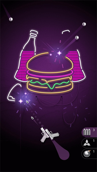 各式各样的霓虹组合成了各种绚丽的图案,你可以使用的武器包括弹珠、飞镖和炸弹,每种武器都有不同的打击方式,利用好它们粉碎这些霓虹。