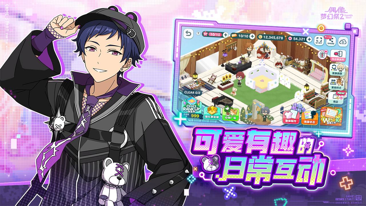 2、在事务所中自由布置家具与主题套装,打造专属偶像家园。更有特殊家具触发趣味互动行为——刨冰摊享清凉美味、卧室戴眼罩酣然入睡……细腻动作呈现偶像生活点滴,拉近你与他的距离;