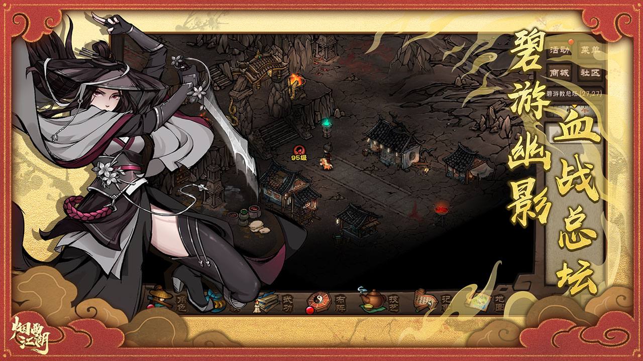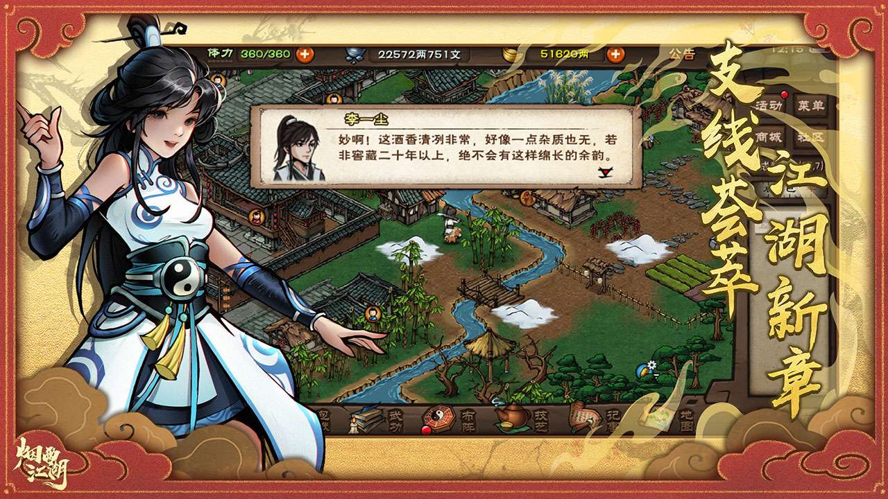 游戏以复古的2D武侠画风呈现细腻江湖场景,搭配轻快BGM营造沉浸氛围,同时突破传统框架,加入上百种新颖玩法(如多分支剧情、门派斗争等),让玩家既能回味经典又能体验创新乐趣,尤其是选择导向的剧情设计大大提升了重复可玩性。