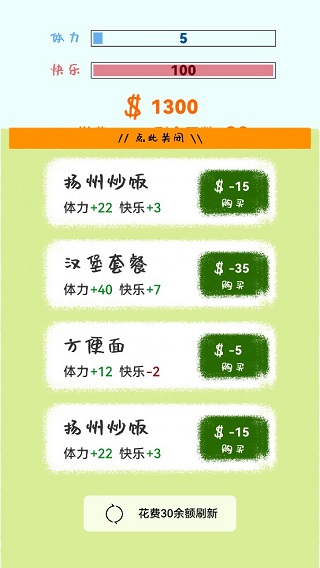 4、玩家需要在30轮中赚取生活费,这样他们才能生活,并为下个月节省足够的租金。我希望你喜欢