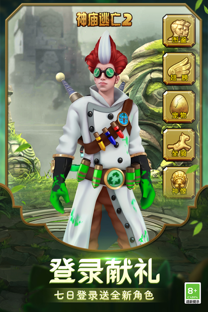 如果你升级到没有金币了,先退出来回到人物选择界面,右边一栏中点击坐骑,在里面找一个叫霸天虎的坐骑,耗费199钻石购买,完成后人物随便你用谁,去跑酷,赚到的金币按之前的推荐表来升级技能,钻石不要乱用,攒着有大用,跑完第二往后,回到主界面,寻找一个新手7天签到的东西,如果没有就先退游戏再重进,如果还是没有,就来tap tap这边,搜索神庙逃亡2,尝试以快游戏的方式进入游玩,如果没有让游玩的选项,把手机上神庙逃亡二的应用删除,再回到这边就可以快速游戏打开了,进入后登录你之前的账号(之前用哪部手机号登录的,这边就用哪个手机号登录),登录进去后,你会在这里面看到新手7天签到,第7天有6个角色让你自选,在里面找到一个叫花神的女角色,选择并点击确定,然后退出来重新下载神庙逃亡二应用,安装到手机再打开,这7天内你不用特别认真玩这游戏,你只要每天上线登录宝珠免费抽奖(主页面找),每日神像免费斩击(角色选择页面右边最下面的神像里面,找到一个叫彩虹神像的玩意,他会告诉你每日可免费斩击,点一下就行),7天内每天上线领签到奖励,免费斩击,免费宝珠抽奖就行了,直到第7天。