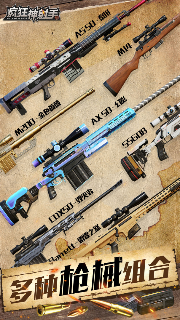 狩猎荒野,多种枪械组合,稀有子弹搭配,自由配件组装,进阶顶尖狙击手。