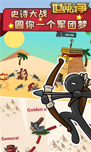 这款游戏和其他的热血战斗火柴人有些不同,这是一款策略型的战斗游戏,游戏中,你需要利用各种武器进行战斗,你需要在这里给你的火柴人装备各种强大的武器并扩大你的规模