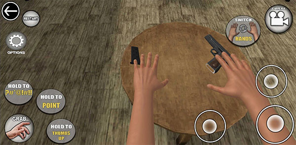 游戏中玩家需要极力的控制你的手掌,你需要争分夺秒的拿起桌上的武器并将其他人干掉,才能获得比赛的胜利,但是在此过程中会发生鬼畜的事件