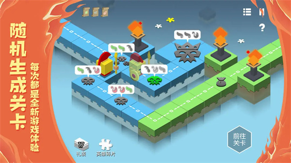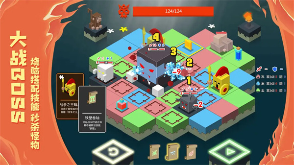 本作为回合制战斗模式。为你的英雄制定一条行动路线,让他按照你制定的路线前进。关卡的地面蕴含着3种元素,你的英雄会在前进过程中自动操控着对应的元素攻击怪物。